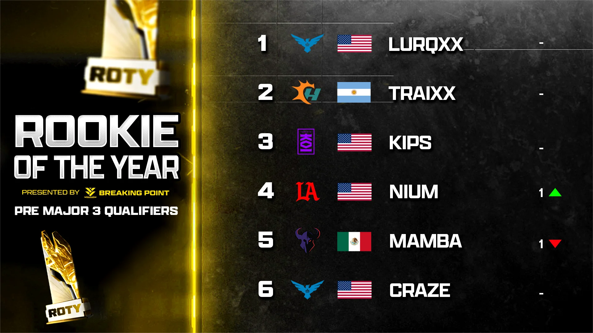 As Stage III approaches, the Rookie of the Year conversation is starting to find its rhythm and its frontrunner. Lurqxx continues to separate himself from the rest of the field, combining consistency, composure, and star‑level production that’s made him one of 2026’s breakout stories. Still, the race is far from over. Traixx, Kips, and Nium remain firmly in the chase, each delivering flashes of brilliance that keep the gap within striking distance heading into the next stage.